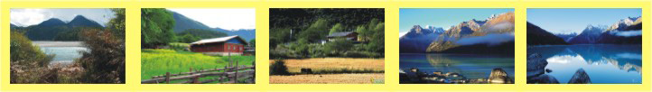的草場和綠油油的莊稼;湖邊山腰上則是莽莽的森林,再往上是五顏六色的杜鵑花和灌木叢林帶;山頂則是終年不化,重重起伏的雪山。