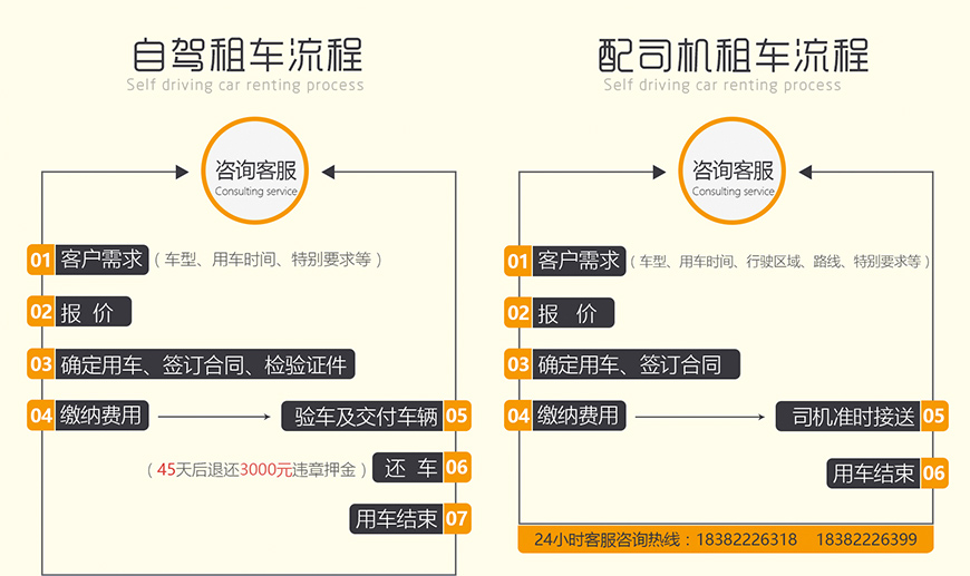 自駕租車流程:咨詢客服——客戶需求(車型、用車時間、特別要求等)——報價——確定用車、簽訂合同、檢驗證件——繳納費用——驗車及交付車輛——還車(45天后退還3000元違章押金)——用車結(jié)束