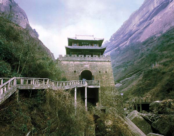 劍門雄關前山雄奇古勁,石梯依山傍崖步入云端,懸崖峭壁亂石嶙峋。后山卻是松翠蓊郁、幽靜雅致,古松漫山遍野,蒼翠綿延,翠屏峰秀美幽深,山路曲折蜿蜒,蕩舟湖間,別有韻味情趣。劍門關主峰大劍山,海拔1200米,山頂有建于宋代的古廟??梁山寺,沿途可飽覽劍門關、石筍峰、穿洞粱、仙女橋,舍生崖等景觀。