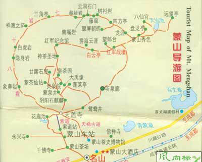 蒙頂山景區(qū)由蒙山和百丈湖兩個(gè)主景區(qū)組合而成,是四川首批省級(jí)風(fēng)景名勝區(qū)之一。座落在名山縣境內(nèi),距成都110公里,離雅安市15公里,318國(guó)道縱貫景區(qū),成都-雅安高速公路兩條引道與蒙山和百丈湖直接相連,交通十分方便。 蒙山,橫亙于名山縣城西北側(cè),山勢(shì)北高南低,呈東北一西南帶狀分布,延伸至雅安境內(nèi)。山體長(zhǎng)約10公里,寬約4公里。蒙頂五峰環(huán)列,狀若蓮花,最高峰上清峰,海拔1456米。從蒙頂西眺可見(jiàn)峨眉、瓦屋、周公諸山。向東俯視,原野平疇,山巒起伏,溪澗縱橫,風(fēng)景如畫(huà)?,F(xiàn)存建筑古剎永興寺、千佛寺、凈居庵等寺廟座落于茶園翠靄茂林間,紅墻梵宇,別增情趣。 蒙山因“雨霧蒙沫”而得名,這里因常年雨量達(dá)2000毫米以上,古稱“西蜀漏天”。西麓雅安有“雨城”之名,又有“雅安多雨,中心蒙山”之說(shuō)。雨多而形成云多、霧多的景象。春夏秋季,從山巔俯瞰,云霧飄浮于山嶺溝壑之間,小山浮露,恰似仙山瓊閣。冬天從山下仰觀,冰絲雪掛,山崗云繞,亦真亦幻。日出時(shí)金光漫射,紅云飄浮。傍晚遠(yuǎn)望名山、雅安兩城萬(wàn)家燈火,如繁星落地,景象萬(wàn)千。 蒙山是中國(guó)種茶業(yè)和茶文化的發(fā)祥地之一,早在兩千多年前的西漢時(shí)期,蒙山茶祖師吳理真好開(kāi)始在蒙頂馴化栽種野生茶樹(shù),開(kāi)始了人工種茶的歷史。唐宋時(shí)是蒙山茶的極盛時(shí)期。從唐玄宗天寶元年(724年)被列為貢品,作為天子祭祀天地祖宗的專用品,在民間,蒙頂茶歷來(lái)被看作祛疾去病的神來(lái)之物。因此,歷史悠久的蒙頂茶被稱為“仙茶”,蒙山被譽(yù)為“仙茶故鄉(xiāng)”。