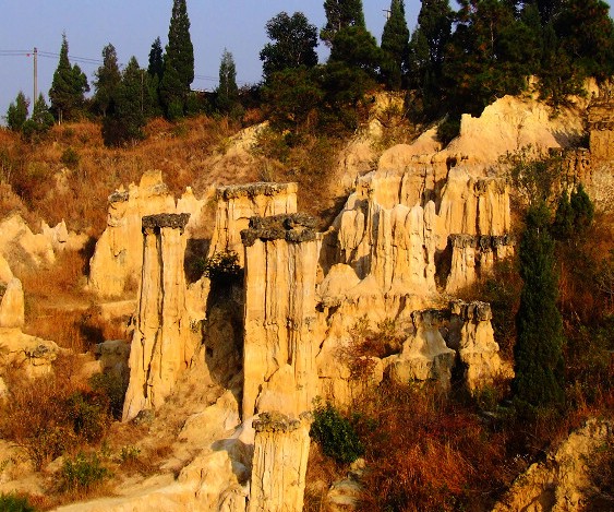 黃聯(lián)土林是在約一億年前的冰河時期,經(jīng)冰水沉積流動和受新地殼運動影響,龜裂的沙粒礫層被地表水長年累月的滲透、沖刷、加深、擴大、立柱而形成的“自然雕塑博物館”。土林狀如云南石林,質(zhì)地卻是黃色砂礫巖土,大多頂部已膠質(zhì)鈣結(jié),不易被風(fēng)化沖刷,故能長久挺立不垮塌。黃聯(lián)土林全景6000多畝,其中自然景觀800多畝,配套石榴園200多畝,景區(qū)周邊造林綠化形成森林面積5000多畝。